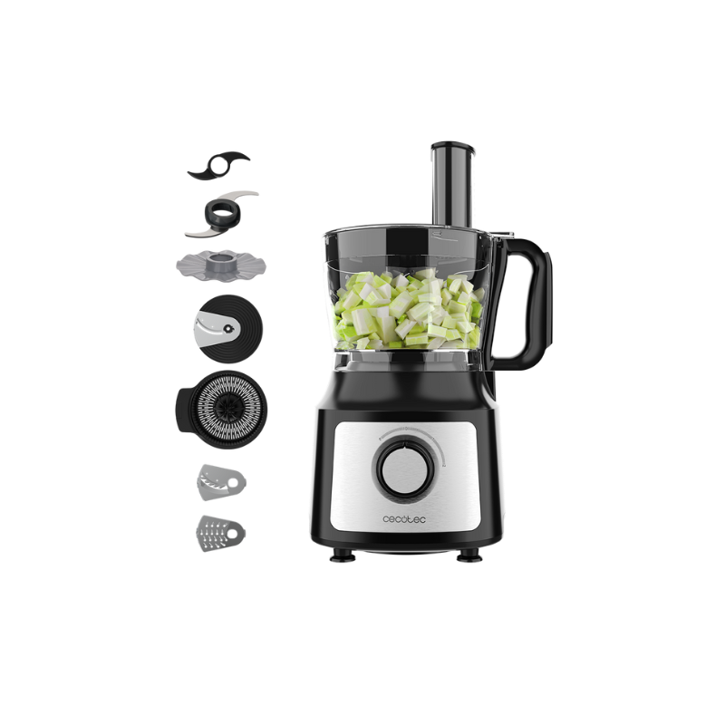 Procesor ushqimi 1000W me tas 2L, shpejtësi të ndryshme, disqe prerëse, teh grirjeje dhe aksesor për brumë. Zgjidhja perfekte për kuzhinë moderne.